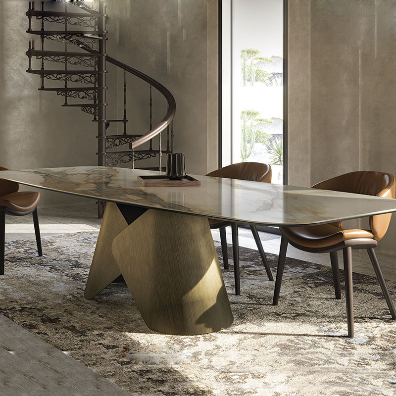 Een exclusieve afwerking wordt geïntroduceerd voor de basis van deze moderne eettafel, speciaal ontworpen om het model te verbeteren.Geoxideerde messing is volledig met de hand geborsteld en heeft een oxidatieve tint die donkerder wordt in de richting van de grond.
