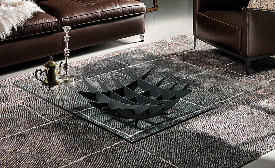 Moderne luxe koffietafel met gesneden stalen basis en doorzichtig glazen dak